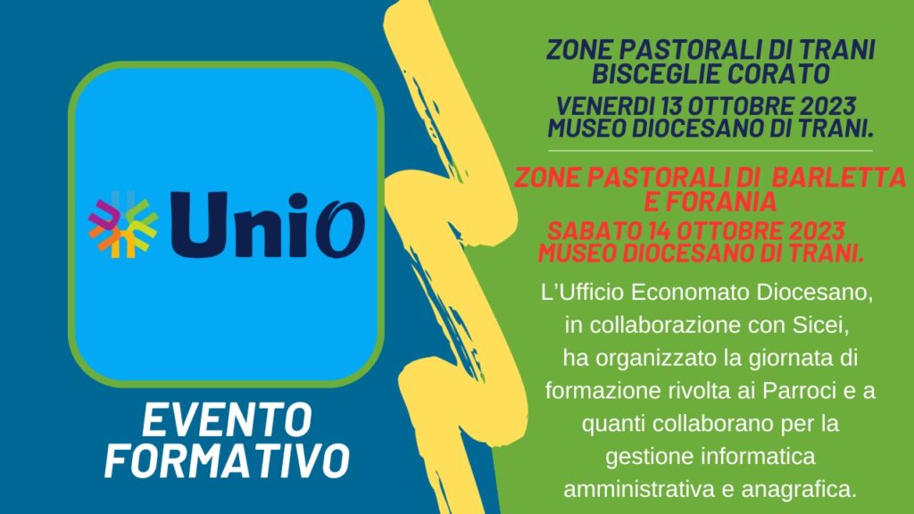 Venerdì 13 ottobre, Zone pastorali di Trani, di Bisceglie, di Corato Sabato 14 ottobre, Zone Pastorali di Barletta, della Forania   Dalla lettera dell’Arcivescovo ai Parroci, Al Consiglio Parrocchiale per gli Affari Economici: Le mutate condizioni in cui le nostre Parrocchie sono chiamate ad operare il loro servizio di annuncio del Vangelo richiedono un continuo aggiornamento degli strumenti a disposizione. Da tempo molte Comunità parrocchiali … Continua a leggere TRANI, PALAZZO LODISPOTO, GIORNATA DI FORMAZIONE PER PARROCI E COLLABORATORI ANAGRAFICA PARROCCHIALE A CURA DEL SICEI »