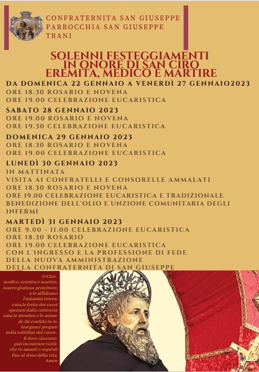 dioc. Trani TRANI. SOLENNI FESTEGGIAMENTI IN ONORE DI SAN CIRO, EREMITA, MEDICO E MARTIRE 23 Gennaio 2023 0 30 clic qui per l’articolo sul sito della Diocesi di Trani-Bisceglie-Barletta ARTICOLI CORRELATIALTRO DALL'AUTORE GIORNATA PRO ORANTIBUS – MONASTERO SAN RUGGIERO INCONTRO DI CLERO ZONA PASTORALE TRANI “SAN NICOLA PELLEGRINO” Giovedì 20 novembre 2025 PDF: I CONTENUTI DEL PRIMO INCONTRO – Prof. Pier Cesare RIVOLTELLA Prof. Pier Cesare RIVOLTELLA – PRIMA SESSIONE INCONTRO DIOCESANO A CORATO UN INCONTRO SULLA LIBERTA’ DI STAMPA – Un diritto da conoscere, difendere e onorare – Per giornalisti e per l’intero pubblico