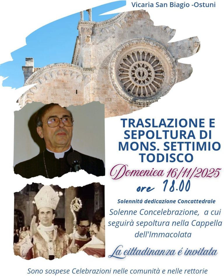 Il Comune di Ostuni ha autorizzato l’estumulazione e la sepoltura in Concattedrale di Mons. Settimio Todisco. Domenica 16 novembre alle 16 la salma sarà traslata in Concattedrale e sarà posta ai piedi dell’altare. Qui alle 18 ci sarà la concelebrazione eucaristica presieduta da S. E. Mons. Domenico D’Ambrosio e concelebrata dai vescovi e dai presbiteri presenti.