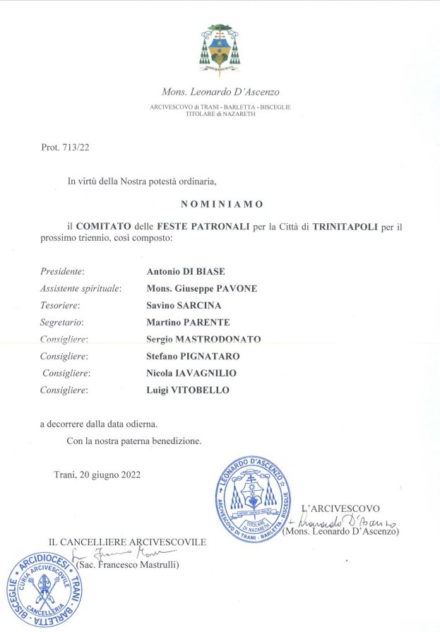 713-22 Nomina Comitato Feste Patronali Trinitapoli – 20GIU2022 TRINITAPOLI. L’ARCIVESCOVO NOMINA IL COMITATO FESTE PATRONALI L’Ufficio diocesano di Cancelleria ha reso noto che, in data 20 giugno 2022, l’Arcivescovo Mons. Leonardo D’Ascenzo ha nominato il Comitato Feste Patronali per la Città di Trinitapoli per il prossimo triennio. L’organismo risulta così composto: Presidente: Antonio Di Biase Assistente spirituale: Mons. Giuseppe Pavone Tesoriere: Savino Sarcina Segretario: Martino … Continua a leggere TRINITAPOLI. L’ARCIVESCOVO NOMINA IL COMITATO FESTE PATRONALI