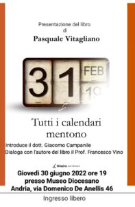 Si terrà giovedì 30 giugno 2022 alle ore 19:00 presso il Museo diocesano ad Andria in via De Anellis 46 la presentazione del libro Tutti i calendari mentono di Pasquale Vitagliano (ed. Giazira Scritture). Introdurrà la presentazione il dott. Giacomo Campanile, dialogherà con l’Autore il Prof. Francesco Vino, docente e storico.