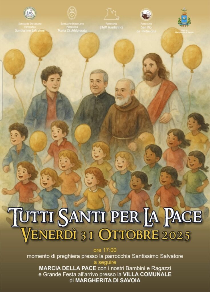 Le parrocchie cittadine invitano tutti, grandi e piccoli, a partecipare a “Tutti Santi per la Pace”, un momento di preghiera e condivisione che si terrà venerdì 31 ottobre alle ore 17:00 presso la Parrocchia Santissimo Salvatore. Seguirà la Marcia della Pace con bambini e ragazzi e una grande festa conclusiva nella Villa Comunale di Margherita di Savoia. Un’occasione per camminare insieme nel segno della pace, … Continua a leggere