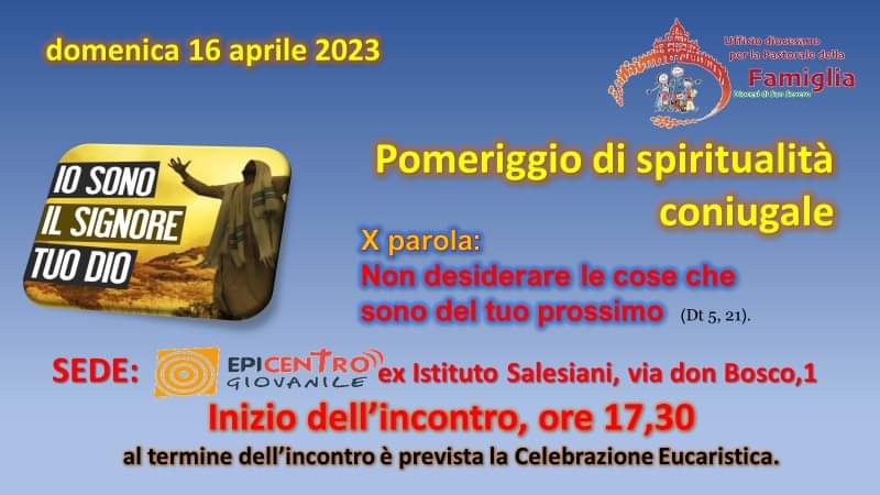 dioc. San Severo UFFICIO DIOCESANO PER LA PASTORALE DELLA FAMIGLIA. Pomeriggio di Spiritualità coniugale. Non desiderare le cose che sono del tuo prossimo 14 Aprile 2023 0 28 L’articolo UFFICIO DIOCESANO PER LA PASTORALE DELLA FAMIGLIA. Pomeriggio di Spiritualità coniugale. Non desiderare le cose che sono del tuo prossimo proviene da Diocesi di San Severo. clic qui per l’articolo sul sito della Diocesi di San Severo ARTICOLI CORRELATIALTRO DALL'AUTORE Diocesi di San Severo » parola alla Parola – GIOVEDÌ 20/11/2025 Diocesi di San Severo » parola alla Parola – DOMENICA 16/11/2025 Diocesi di San Severo » UN VOTO per COSTRUIRE SPERANZA e FRATERNITÀ Diocesi di San Severo » parola alla Parola – SABATO 15/11/2025 Diocesi di San Severo » parola alla Parola – VENERDÌ 14/11/2025
