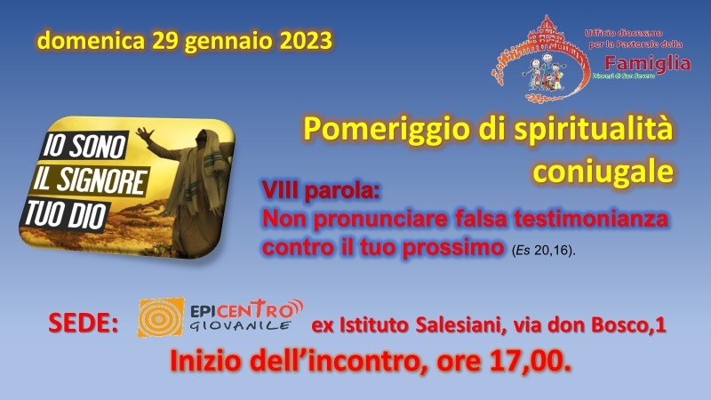 L’articolo UFFICIO DIOCESANO PER LA PASTORALE DELLA FAMIGLIA. Pomeriggio di Spiritualità coniugale. Non pronunciare falsa testimonianza contro il tuo prossimo proviene da Diocesi di San Severo.