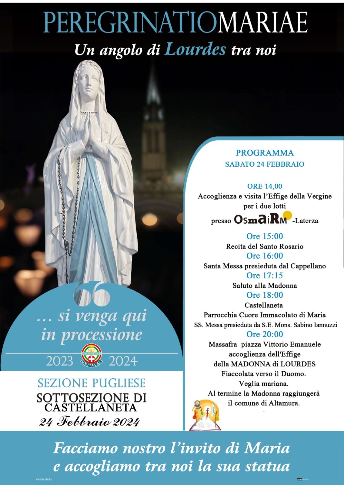 Sabato 24 Febbraio i paesi di Laterza, Castellaneta e Massafra accoglieranno l’immagine della Madonna di Lourdes. L’evento è organizzato dalla sottosezione di Castellaneta dell’Unitalsi.