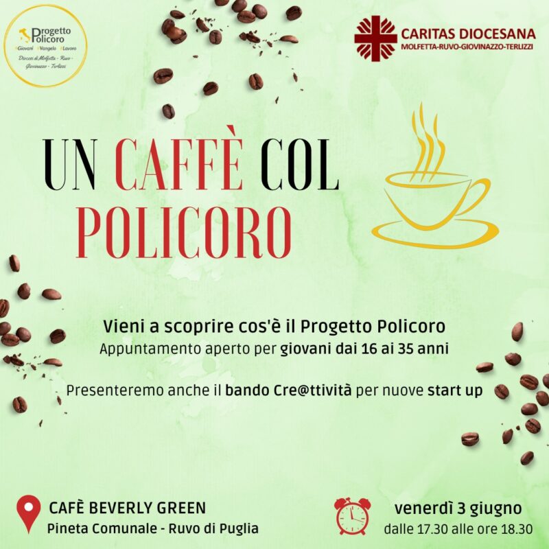 Progetto Policoro e Caritas diocesana continuano a incontrare i giovani tra i 16 e 35 anni. Appuntamento per venerdì 3 giugno con l’evento informale e aperto “Un caffè col Policoro”, presso il Cafè Beverly Green, nella Pineta Comunale di Ruvo di Puglia dalle 17.30 alle 18.30.
