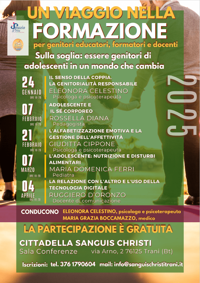 dioc. Trani UN VIAGGIO NELLA FORMAZIONE … PER GENITORI, EDUCATORI, FORMATORI E DOCENTI 3 Gennaio 2025 0 23 clic qui per l’articolo sul sito della Diocesi di Trani-Bisceglie-Barletta ARTICOLI CORRELATIALTRO DALL'AUTORE INCONTRO DI CLERO ZONA PASTORALE TRANI “SAN NICOLA PELLEGRINO” Giovedì 20 novembre 2025 PDF: I CONTENUTI DEL PRIMO INCONTRO – Prof. Pier Cesare RIVOLTELLA Prof. Pier Cesare RIVOLTELLA – PRIMA SESSIONE INCONTRO DIOCESANO A CORATO UN INCONTRO SULLA LIBERTA’ DI STAMPA – Un diritto da conoscere, difendere e onorare – Per giornalisti e per l’intero pubblico BISCEGLIE, PARROCCHIA SANT’ANDREA APOSTOLO, CELEBRAZIONE EUCARISTICA PRESIEDUTA DALL’ARCIVESCOVO PER L’INIZIO DEL MINISTERO PASTORALE DI PARROCO DI DON FRANCESCO LORUSSO