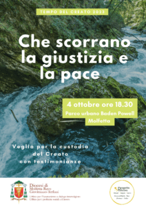 L’Ufficio per i problemi sociali e il lavoro e l’Ufficio per l’ecumenismo e il dialogo intereligioso, in collaborazione con il Progetto Policoro, promuovono un momento di preghiera in occasione della conclusione del Tempo per la Cura del Creato 2023. La veglia avrà luogo mercoledì 4 ottobre 2023, alle ore 18:30, presso l’area Eventi del Parco Urbano Baden Powell di Molfetta.