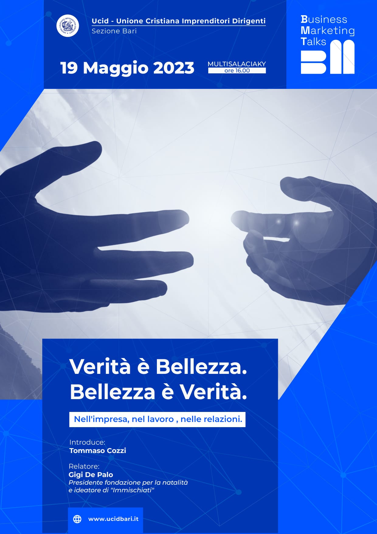 Nell’ambito del Festival dell’Innovazione Digitale, ospite dell’Unione Cristiana Imprenditori e Dirigenti, venerdì 19 maggio alle ore 16.00 Gigi De Paolo, presidente della Fondazione per la Natalità, svilupperà il tema “Verità è Bellezza. Bellezza è Verità”