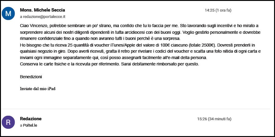 Un piano che non fa una piega, studiato a tavolino da veri “professionisti della truffa” e che è ben spiegato nella mail appena arrivata e che recita così: “Ciao Vincenzo, potrebbe sembrare un po’ strano, ma confido che tu lo faccia per me. Sto lavorando sugli incentivi e ho mirato a sorprendere alcuni dei nostri diligenti dipendenti in tutta arcidiocesi con dei buoni oggi. Voglio gestirlo personalmente e dovrebbe rimanere confidenziale fino a quando non avranno tutti i buoni perché è una sorpresa. Ho bisogno che tu riceva 25 quantità di voucher iTunes/Apple del valore di 100€ ciascuno (totale 2500€). Dovresti prenderli in qualsiasi negozio in giro. Dopo averli ricevuti, gratta il retro per rivelare i codici del voucher e scatta una foto nitida di ogni carta e inviami ogni immagine separatamente qui, così posso assegnarli facilmente all’e-mail della persona. Conserva le carte fisiche e la ricevuta per riferimento. Sarai debitamente rimborsato per questo. Benedizioni”.