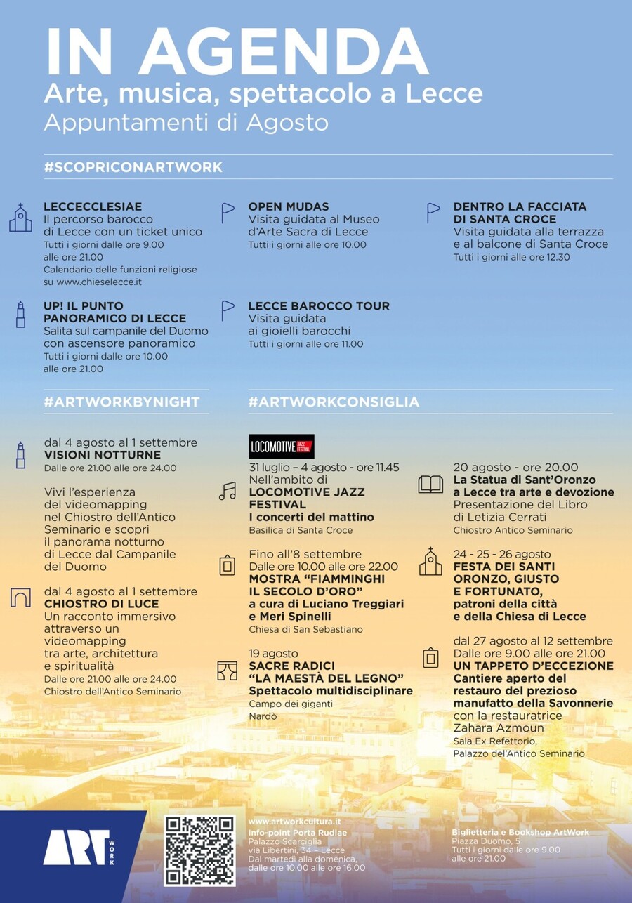 Il videomapping nel chiostro dell’antico seminario è invece una summa artistica, storica e religiosa della comunità leccese, con riferimenti precisi alle opere d’arte custodite nel Museo diocesano di arte sacra di Piazza Duomo, ad alcune pagine salienti della storia di Lecce nel contesto del Mediterraneo – con un importante richiamo alla vittoria di Lepanto nel 1571 – alle chiese del circuito LeccEcclesiae e alla festa di Sant’Oronzo. Il progetto “Chiostro di Luce” è realizzato da ArtWork in collaborazione con l’arcidiocesi di Lecce, la Fondazione Splendor Fidei e “Arte Amica”.