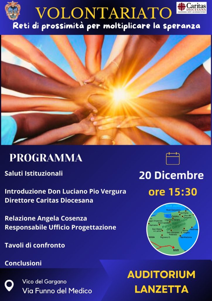 dioc. Manfredonia Volontariato – Arcidiocesi di Manfredonia – Vieste – San Giovanni Rotondo 19 Dicembre 2024 0 24 19 Dicembre 2024 Reti di prossimità per moltiplicare la speranza Venerdì 20 dicembre 2024 presso l’Auditorium “Lanzetta” in Vico del Gargano alle ore 15.30 ci sarà il Sinodo del mondo del volontariato dal tema: Volontariato. Reti di prossimità per moltiplicare la speranza clic qui per l’articolo sul sito diocesano ARTICOLI CORRELATIALTRO DALL'AUTORE RETE INTERNAZIONALE “PRETI CONTRO IL GENOCIDIO” – Lettera aperta ai Vescovi Italiani in occasione della preghiera per la pace ORDINAZIONE DI DON MICHELE COPPOLECCHIA – Arcidiocesi di Manfredonia – Vieste – San Giovanni Rotondo ORDINAZIONE PRESBITERALE DI DON ELISEO COSTANTINO – Arcidiocesi di Manfredonia – Vieste – San Giovanni Rotondo GIORNATA MONDIALE DEI POVERI – 2025 – Arcidiocesi di Manfredonia – Vieste – San Giovanni Rotondo Un voto per costruire Speranza e Fraternità – Arcidiocesi di Manfredonia – Vieste – San Giovanni Rotondo