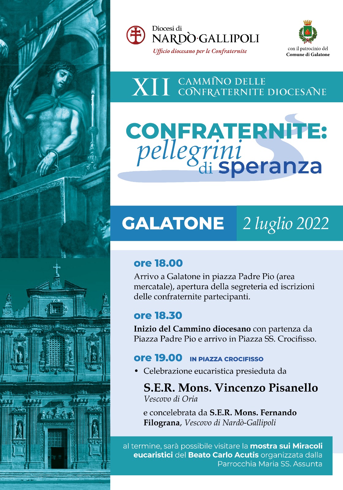 2 LUGLIO – Sarà Galatone ad ospitare quest’anno la ripresa dell’ormai tradizionale Cammino Diocesano delle Confraternite, giunto alla sua XII edizione. Nel mentre viviamo ancora un tempo di incertezza i parroci della cittadina, coadiuvati dal diacono Luigi Nocita (direttore dell’Ufficio Confraternite Diocesano) già da tempo hanno iniziato la preparazione dei fedeli a questo importantissimo appuntamento.